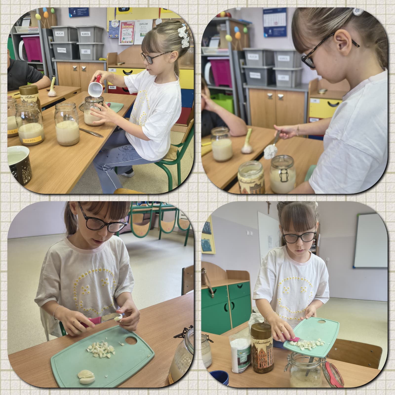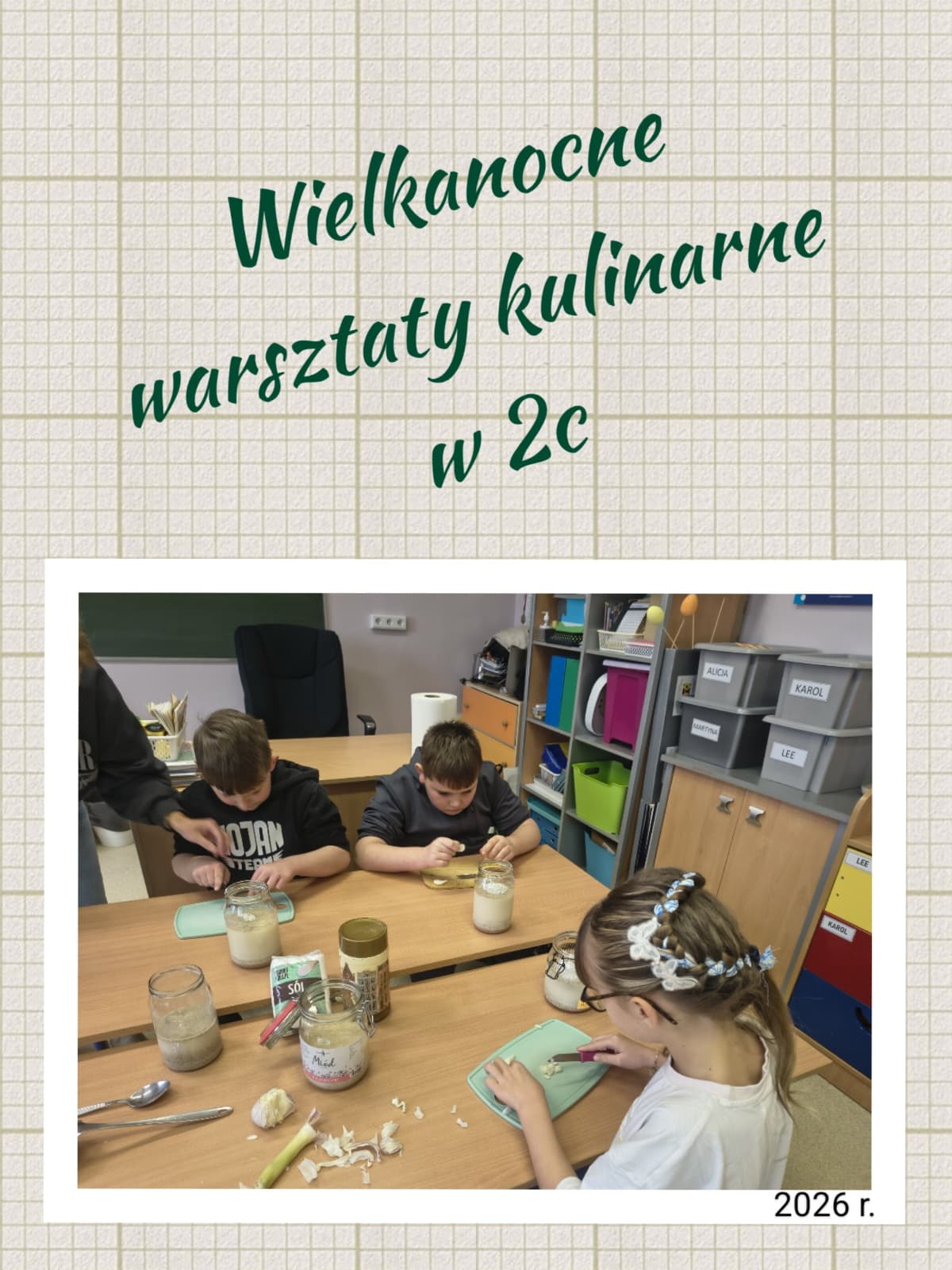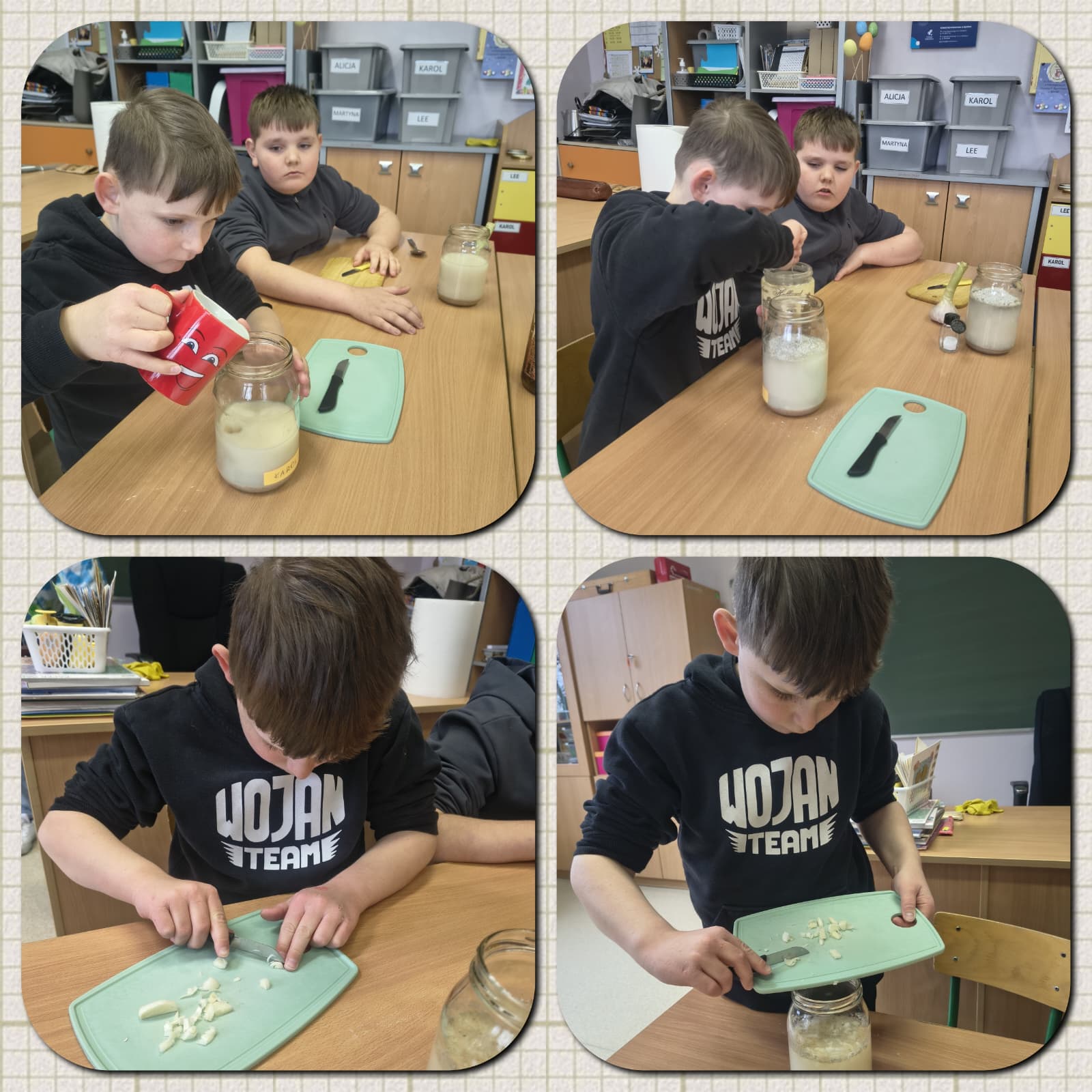 Uczniowie klasy 2c, jak co roku, kultywują tradycję wielkanocną, przygotowując własny zakwas na żurek. To wyjątkowe doświadczenie pozwala im poznać dawne zwyczaje oraz wspólnie celebrować nadchodzące Święta Wielkanocne. Dodatkowo dzieci wykonały urocze baranki z pomponów, które pięknie dopełniły świąteczny nastrój i wprowadziły jeszcze więcej radości w oczekiwaniu na święta.
