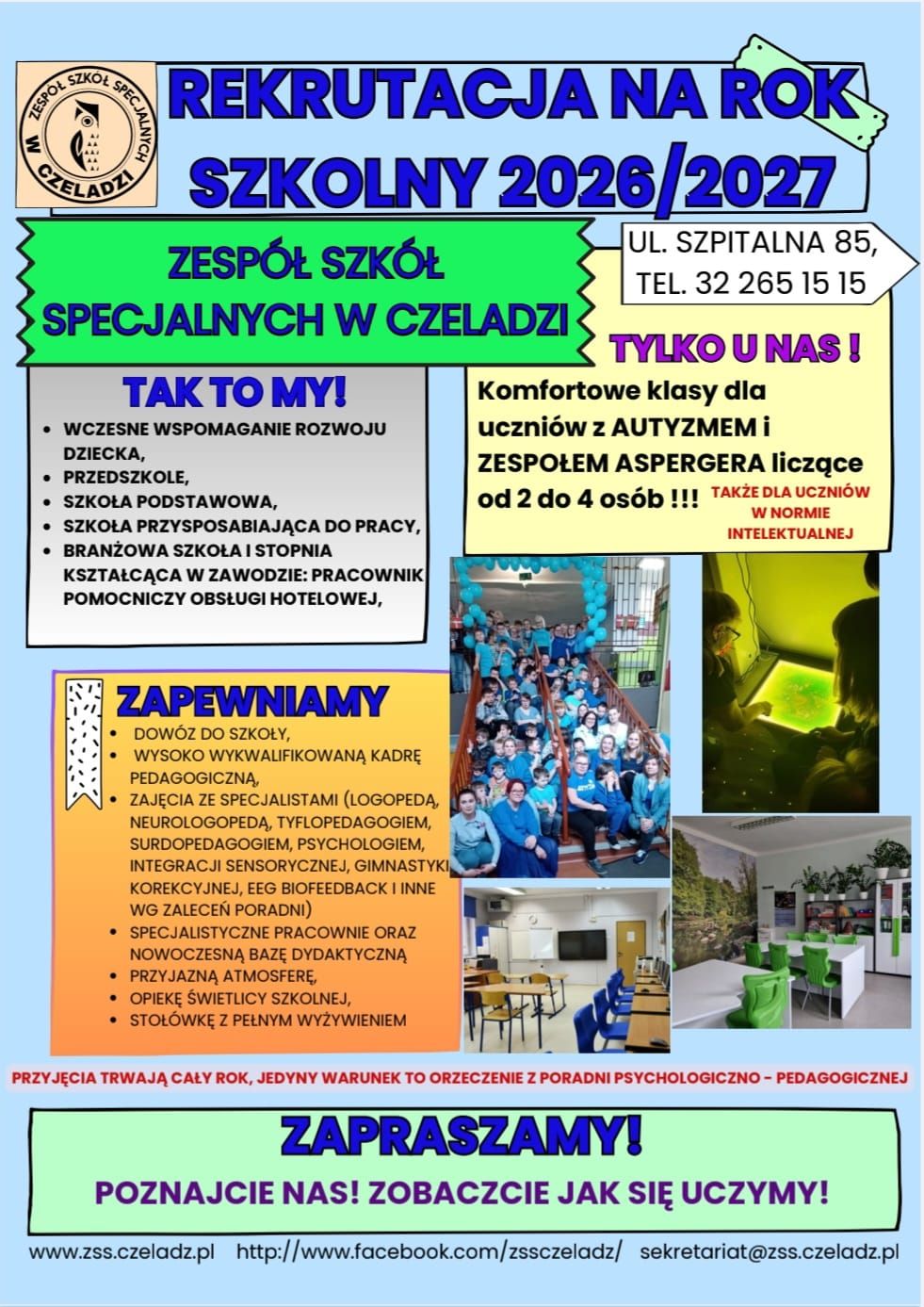 Zespół Szkół w Czeladzi jest specjalistyczną placówką edukacyjną kształcącą dzieci i młodzież wymagającą przede wszystkim indywidualnej pomocy wykwalifikowanej kadry pedagogicznej.