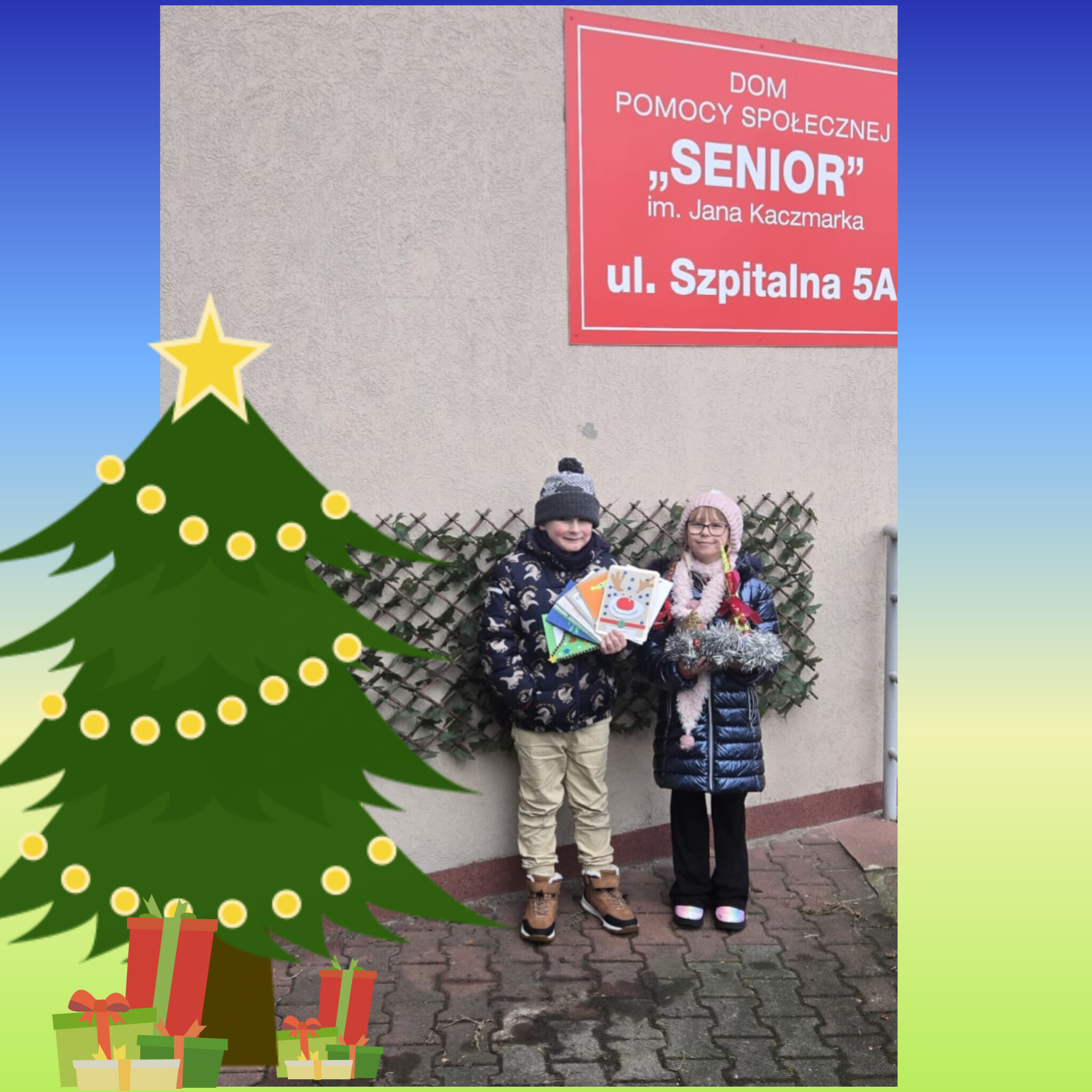 Uczniowie klasy 2C, reprezentując całą społeczność szkolną, przekazali na ręce Dyrektora Domu Pomocy Społecznej „Senior” w Czeladzi upominek oraz kartki z serdecznymi życzeniami świątecznymi. Życzenia te skierowane były do wszystkich Pensjonariuszy oraz Pracowników placówki, jako wyraz pamięci, życzliwości i świątecznej solidarności.