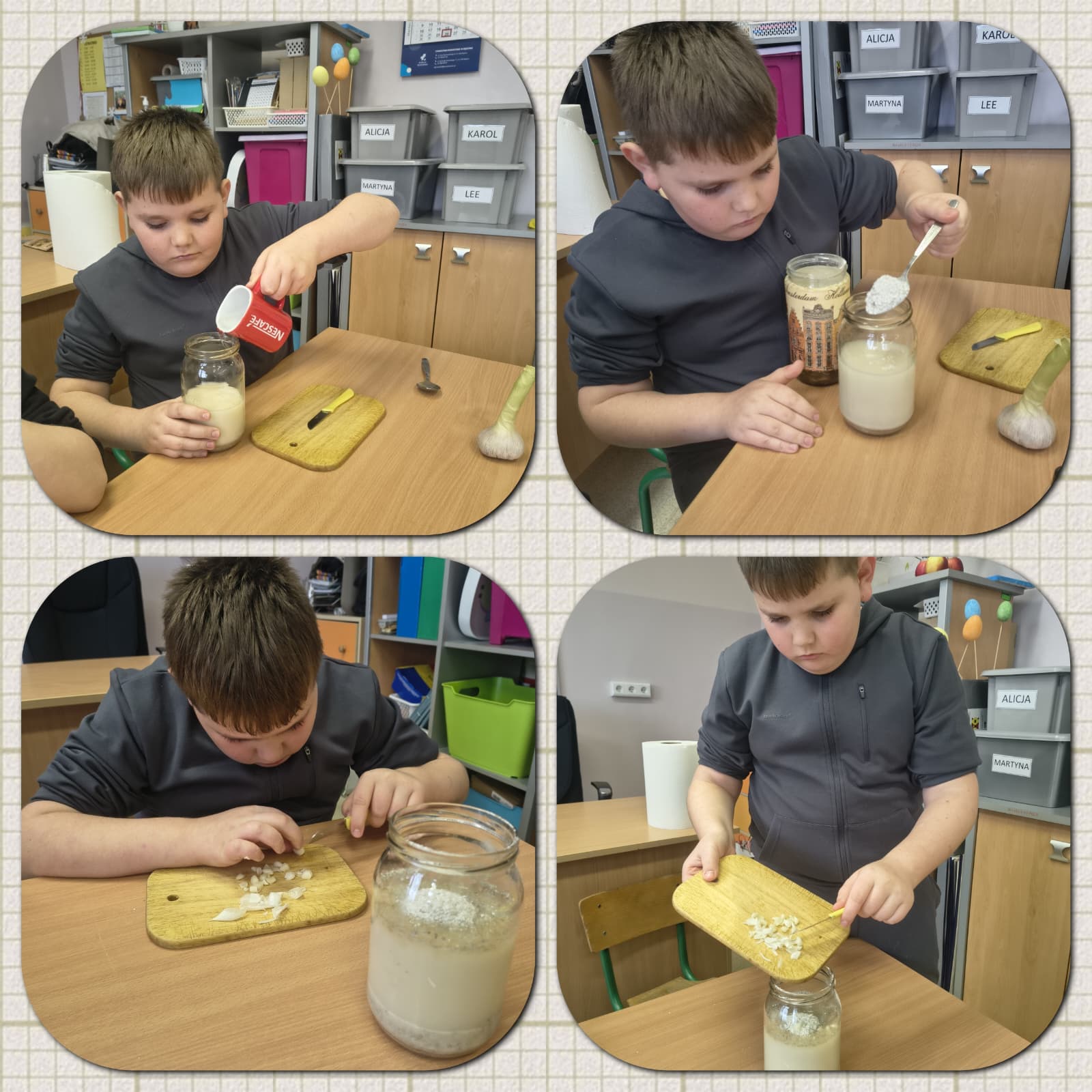 Uczniowie klasy 2c, jak co roku, kultywują tradycję wielkanocną, przygotowując własny zakwas na żurek. To wyjątkowe doświadczenie pozwala im poznać dawne zwyczaje oraz wspólnie celebrować nadchodzące Święta Wielkanocne. Dodatkowo dzieci wykonały urocze baranki z pomponów, które pięknie dopełniły świąteczny nastrój i wprowadziły jeszcze więcej radości w oczekiwaniu na święta.